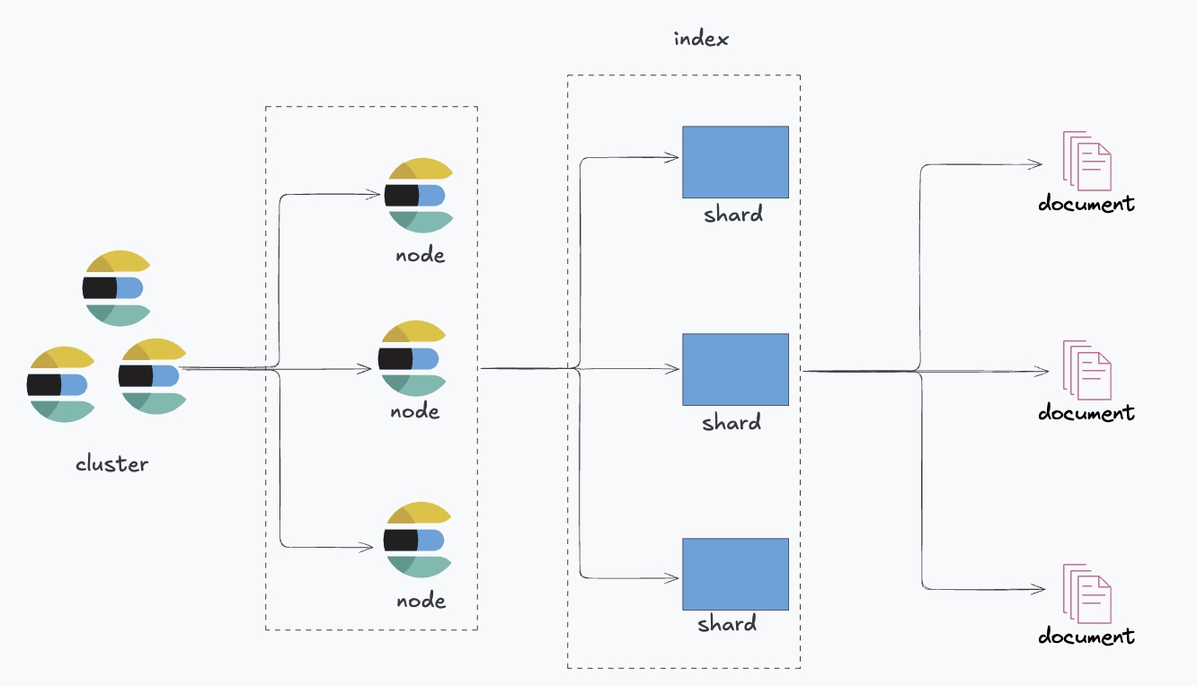 Cluster:集群。是Elasticsearch的基本单位,由一个或多个节点组成,这些节点共同存储数据并处理请求。每个集群都有一个唯一的名称,所有加入该集群的节点都必须配置相同的集群名。集群提供了数据分布、高可用性、负载均衡和故障恢复等功能。ES会自动把索引拆分为多个分片,并分布到不同节点上,因此能够高效处理大规模数据和查询请求。