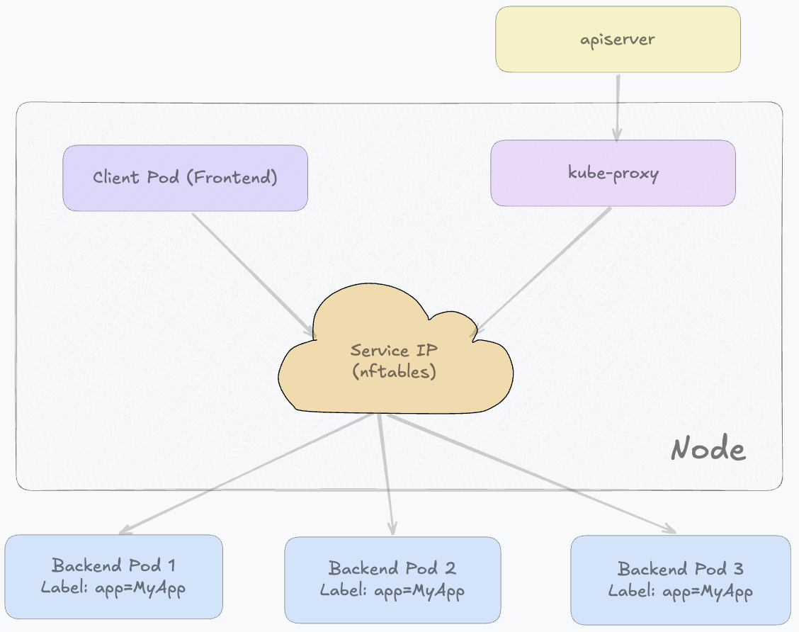 在运行过程中,kube-proxy仍然持续监听API Server中Service和EndpointSlice的变化。只是它会将这些变化同步到nftables规则中。每个Endpoint通常会对应一条规则或一个集合项,用于描述该Service可以转发到哪些Pod。默认情况下,nftables会在多个后端Pod中随机选择一个作为目标,从而实现负载均衡。