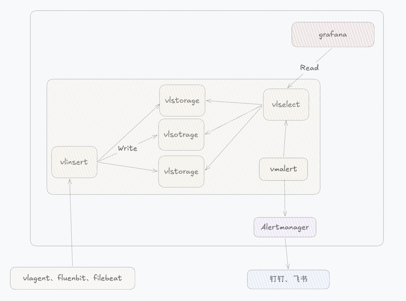 - vlselect:是整个系统的查询层。主要负责接收用户请求,解析查询语句,并从多个vlstorage节点拉取数据,再进行聚合并返回结果