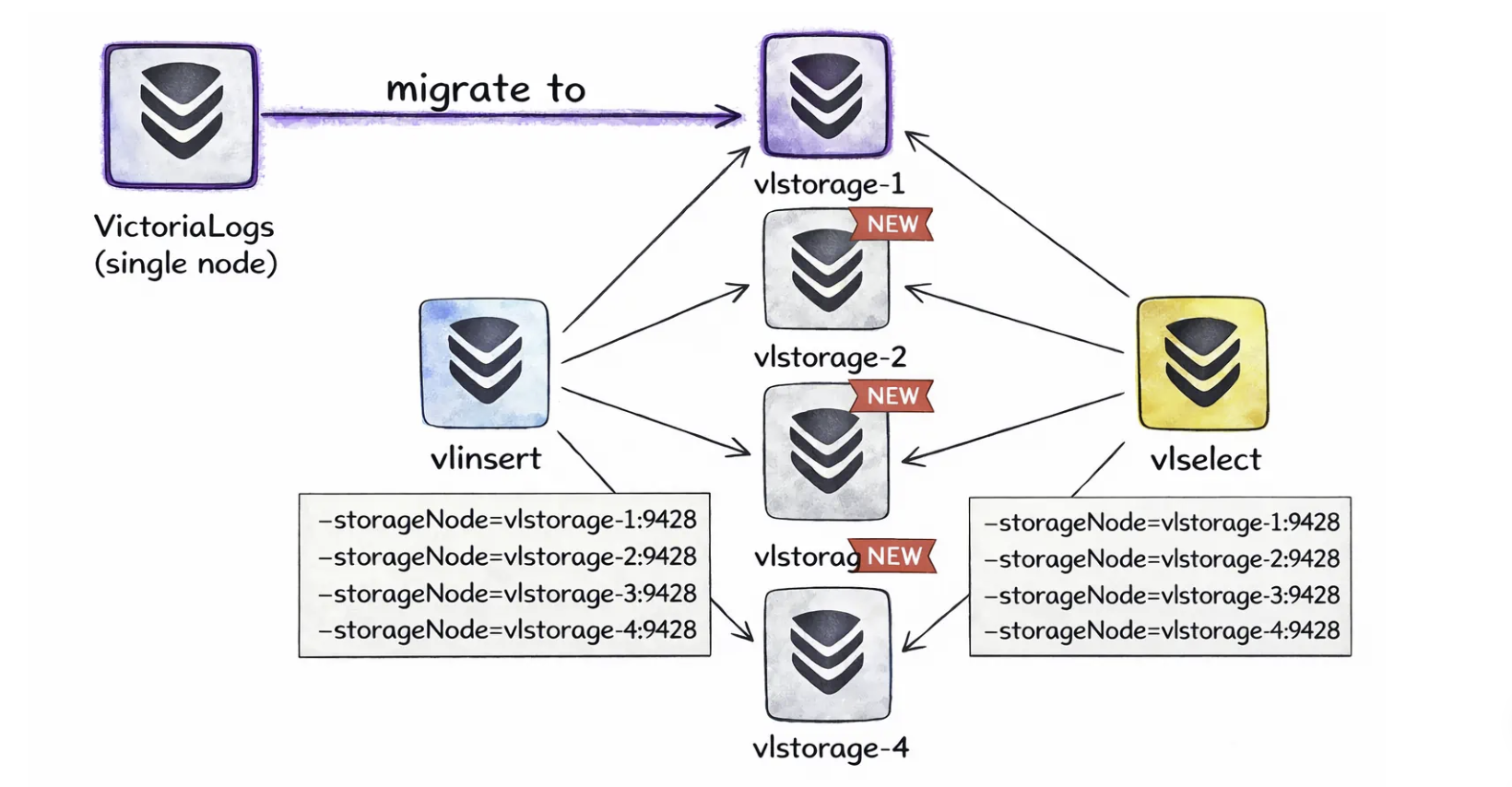 如上图,从单节点切换至集群非常简单。你可以保留现有的单节点victoriaLogs(vlstorage-1),再部署多个storage实例,并启动一个或多个vlinsert/vlselect实例即可。