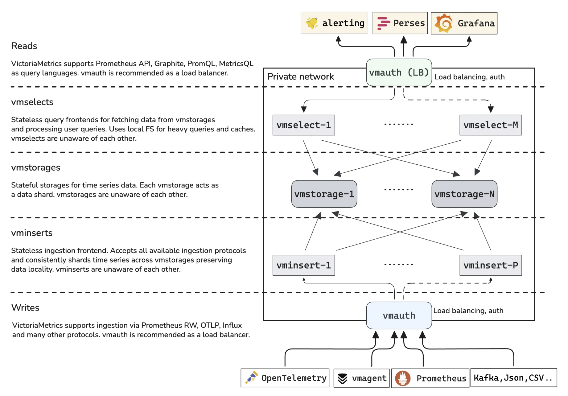 victoriaMetrics集群版的架构如下: